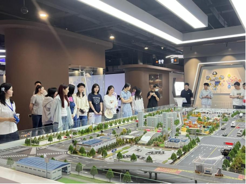 队伍一行参观三层工程机械展厅,在“振华30号”起重机和港珠澳大桥路面摊铺机模型前,师生们深刻体会到这些“国之重器”在超级工程中的关键作用。师生在智能交通展区全方位了解智慧交通的发展现状,畅想其未来发展的无限可能。