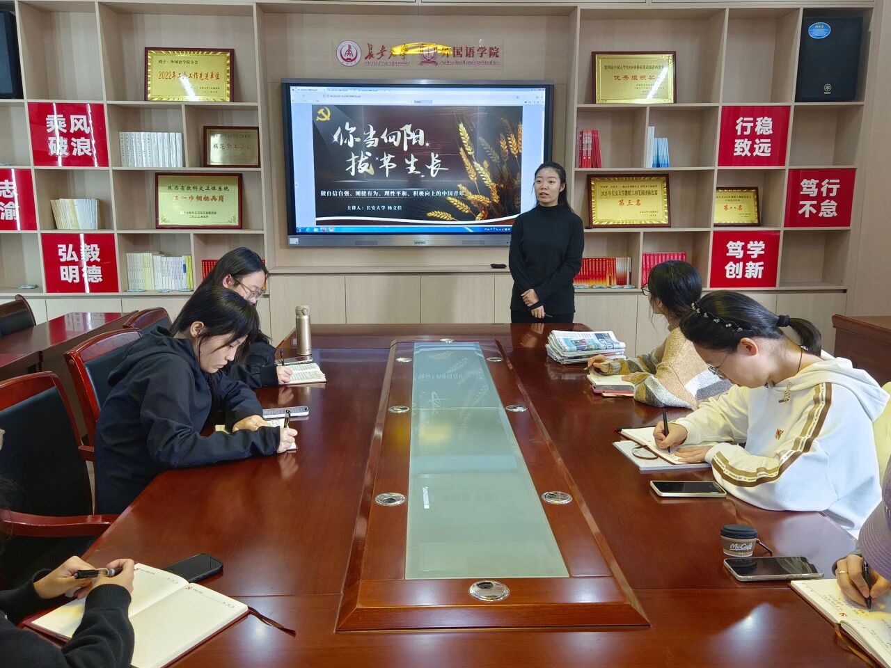 2025年10月27日上午,长安大学外国语开元kaiyuan(中国)本科生党支部在开元kaiyuan(中国)115党建活动室开展“你当向阳,拔节生长”主题微党课,党支部书记杨文佳担任主讲人,支部全体党员参加学习。