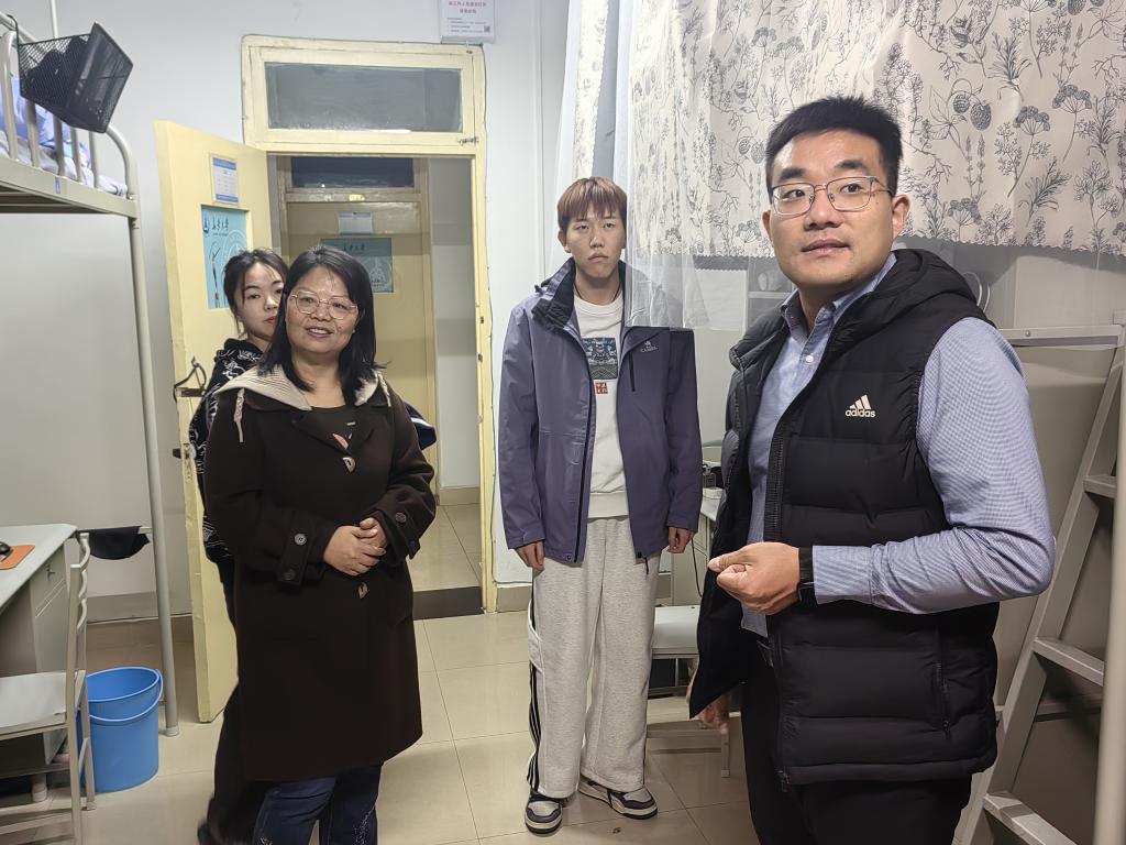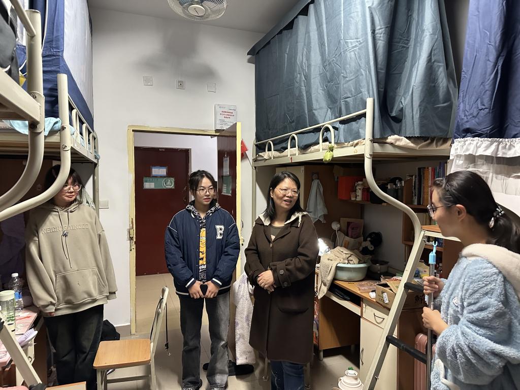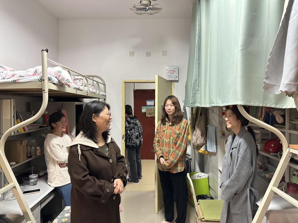 为深入了解学生思想动态和学习生活情况,进一步落实近期学生工作要求,切实做好学生关心关爱工作,11月7日晚,我院党委副书记勾小群、学办副主任王子章、兼职辅导员金灵玲走访各年级学生宿舍,扎实做好学生管理和安全稳定工作。