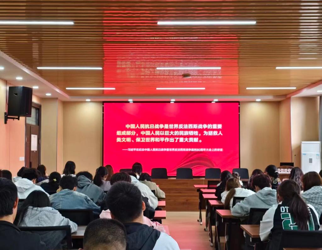 会上,2025级新生辅导员王子章带领同学们回顾抗日战争历程,从 “九一八事变”揭开战争序幕,到抗战期间各大关键战役的英勇抗争,再到最终取得胜利的重大意义,清晰阐述了抗日战争作为中华民族觉醒转折点、世界反法西斯战争重要组成部分的历史价值,帮助学生们深化历史认知,深刻感悟抗战胜利的来之不易。