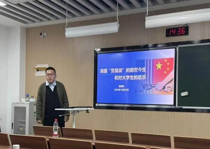 张镓欣以国际贸易的历史发展脉络为切入点,通过梳理不同时期全球贸易体系的特征与变革,引导学生跳出短期热点视角,从长期维度理解国际经济互动的底层逻辑与摩擦演变规律。在解读国际经济形势的基础上,张镓欣博士进一步结合外语专业学生的成长需求,拆解个人发展与全球趋势的关联逻辑。他建议同学们夯实核心能力,积极拓展国际视野,培养对全球热点的敏感度与分析能力。