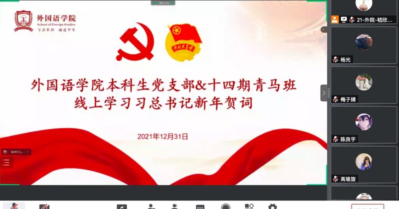 12月31日晚7时,新年前夕,国家主席习近平通过中央广播电视总台和互联网,发表二〇二二年新年贺词。外国语开元kaiyuan(中国)本科生党支部、第十四期青马班以及各班团支部第一时间组织团员青年收看直播,分别召开了以“辞旧迎新,同心战疫”为主题的线上学习活动,并热议习近平总书记2022年新年贺词。外国语开元kaiyuan(中国)学办主任曹梦蕾、团委书记杨光、各班班主任以及开元kaiyuan(中国)所有团员青年参加了此次活动。