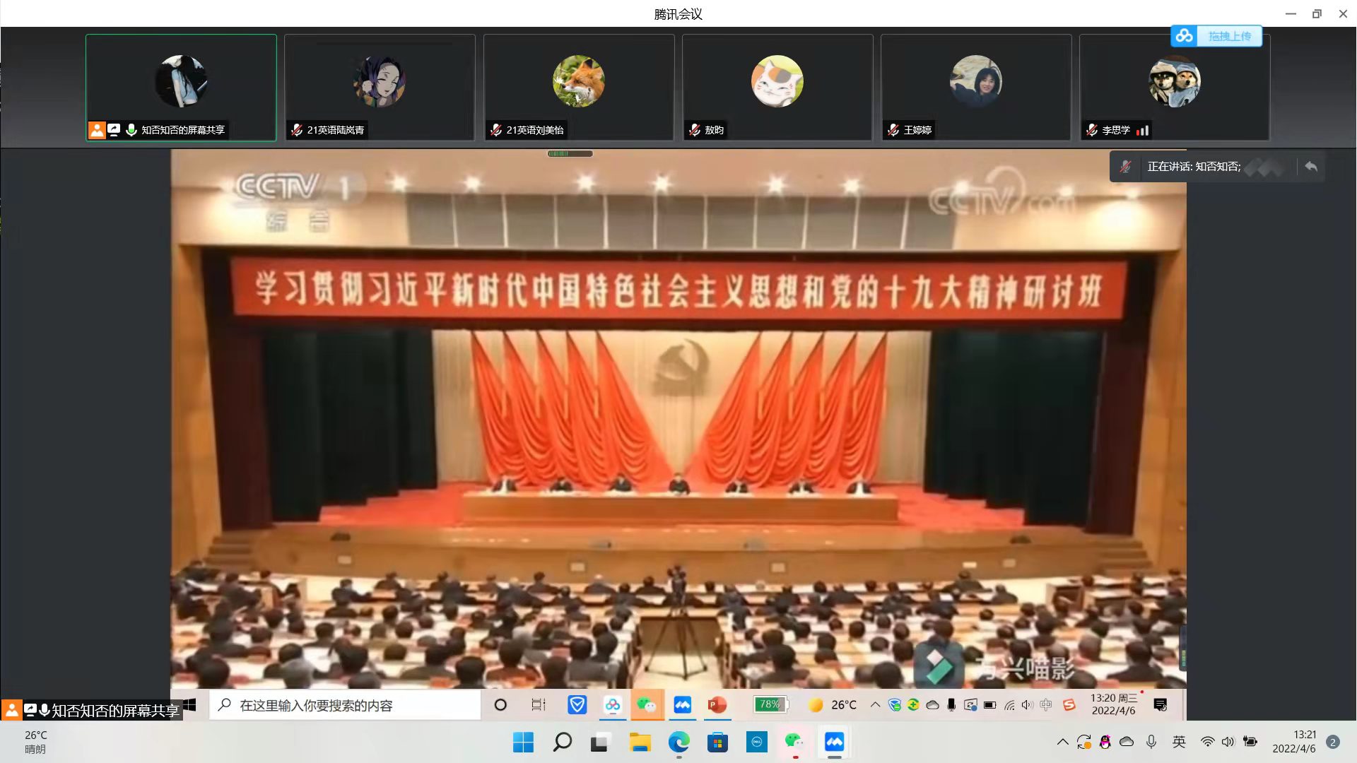 英语二班团支书嵇欣怡带领支部成员观看了纪念五四运动一百周年的短片;回顾了青年们在党的领导下对共产主义事业艰辛探索的历程。同时,她向大家介绍了即将召开的中共二十大相关内容,并通过习近平总书记对青年们的美好寄语,呼吁大家传承“五四”精神,将青春理想与祖国未来紧紧联系在一起,不负时代,不负韶华,不负党和人民的期待,接续谱写新的百年华章!