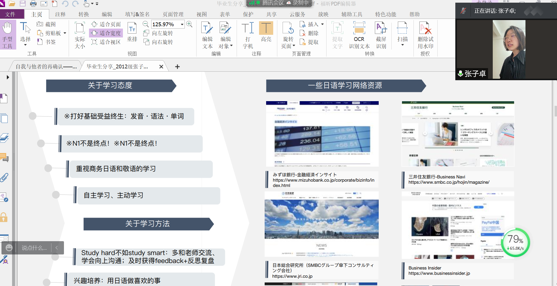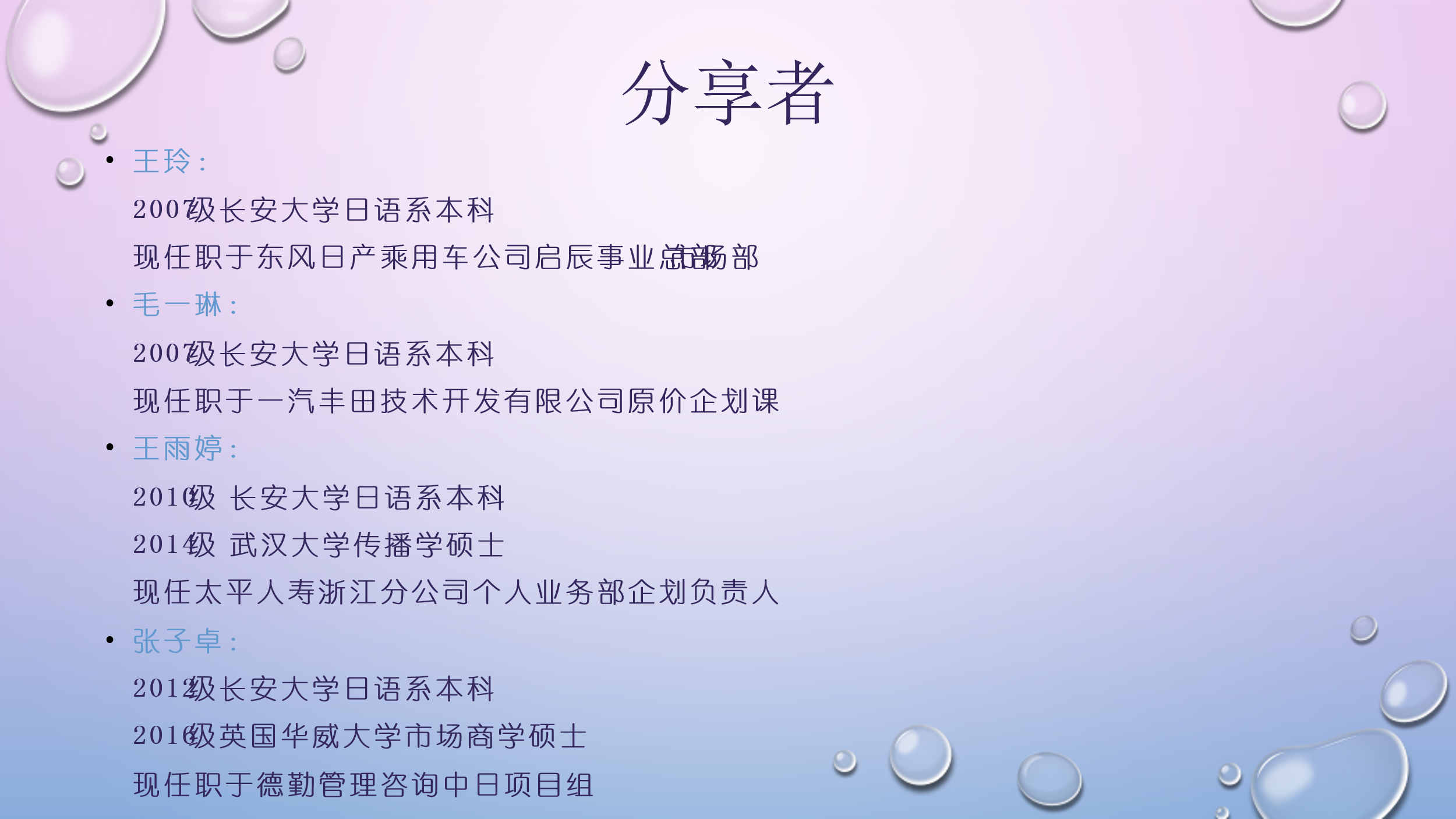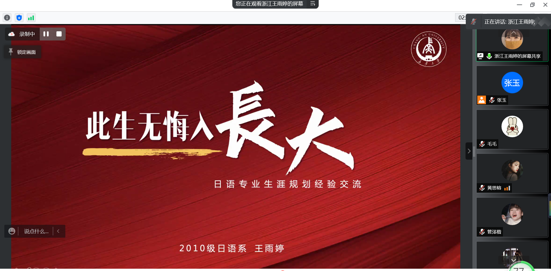 为帮助学生开阔就业视野,进一步解答同学们对日语专业生涯规划的困惑,坚定同学们对未来发展的信心,2021级日语班班主任张玉老师于4月9日晚特别邀请我系2007级王玲、毛一琳、2010级王雨婷、2012级张子卓四位优秀毕业生为同学们分享了她们的学习历程、求职经验与工作感悟。本次分享会以腾讯会议的方式线上举行,日语系周莉老师、2021级、2020级、2019级近40师生全程参与,反响热烈。
