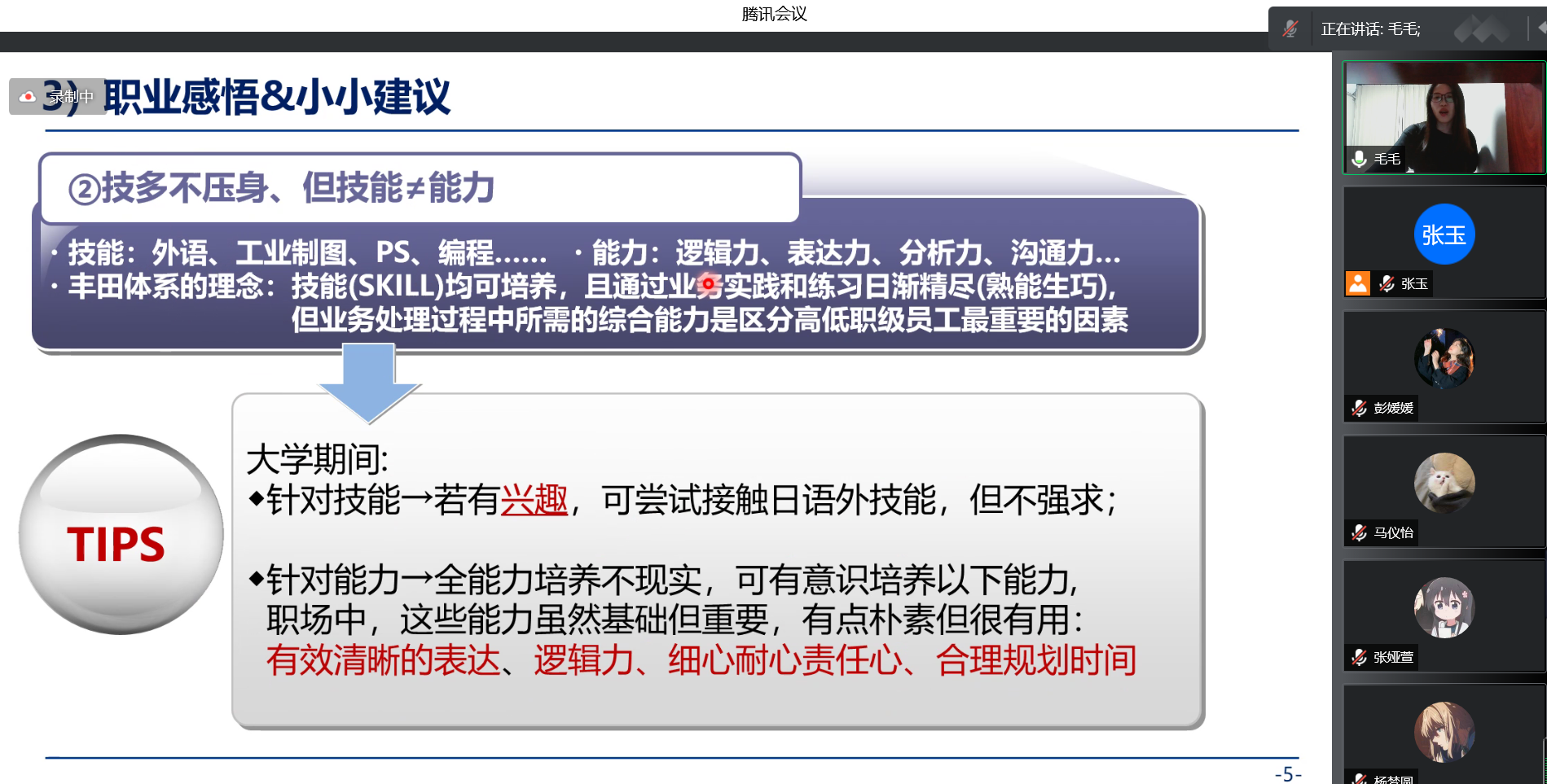 现任职于一汽丰田技术开发有限公司的毛一琳学姐分享了自己十年来的工作经历,为大家展现了真实且具体的工作内容与公司化,揭开了一流车企的神秘面纱。她指出,作为日语专业的学生,良好的日语基础能为我们今后的职业发展提供大量机会,但语言仅是沟通工具,如何找到业务方向,是每个日语专业学生面临的课题。因此,她建议在大学期间应刻意培养有效清晰的表达、细心耐心责任心、合理规划时间等方面的能力;与此同时,养成良好的作息习惯和运动习惯、培养兴趣爱好,保持身心健康;在此基础上坚定目标,不断努力,结果自会水到渠成。