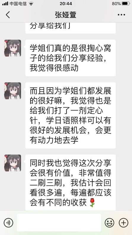 在自由提问环节,同学们纷纷讲出了目前在日语学习和就业方面的困惑与迷茫之处,学姐们也从多年的工作经历和感悟出发为大家答疑解惑、献计献策。