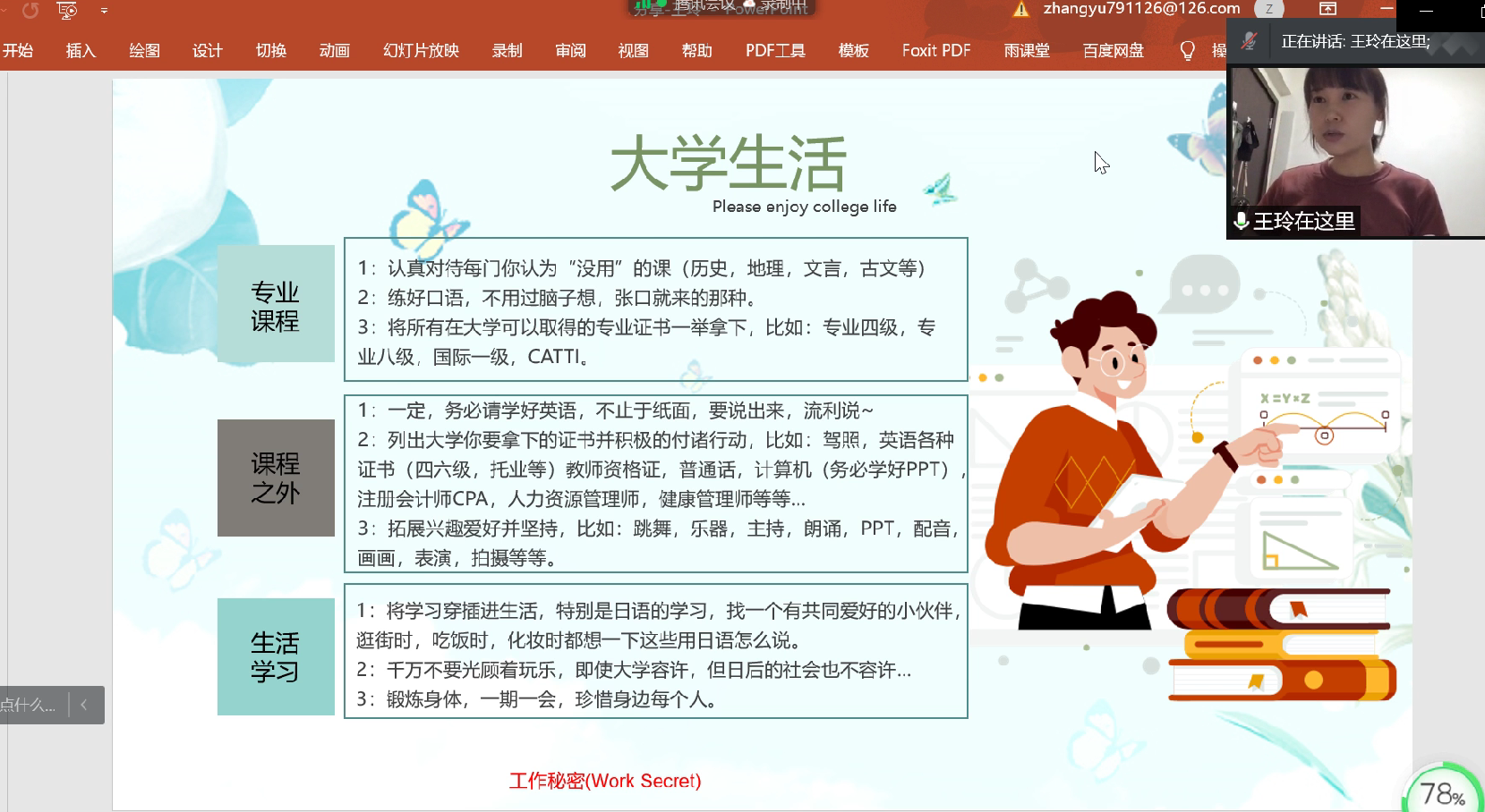 现任职于东风日产乘用车公司的王玲学姐分享了十年来在东风日产担任日语翻译的工作经验与学习建议。她建议要认真对待每一门课,将日语学习贯彻到生活的点点滴滴;在专业课程之外,学有余力的前提下可以学习其他技能,培养专属于自己的能力,找到自己的优势与兴趣点;热爱生活保持身体健康珍惜身边每个人。她认为语言只是工具,并不是我们的终点,择业时要放宽视野,了解感兴趣的职业,根据不同的职业要求提升自己。