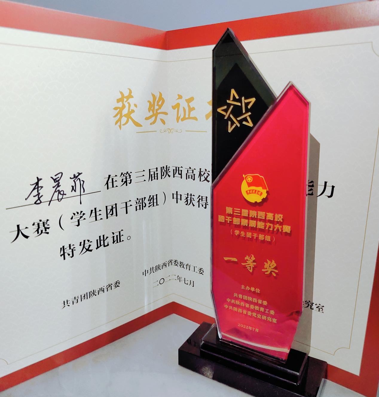 7月2日,第三届陕西高校团干部素质能力大赛决赛暨颁奖仪式在西北工业大学友谊校区举办。经过激烈角逐,我院团委副书记、2020级英语专业本科生李晨菲荣获学生团干部组一等奖。