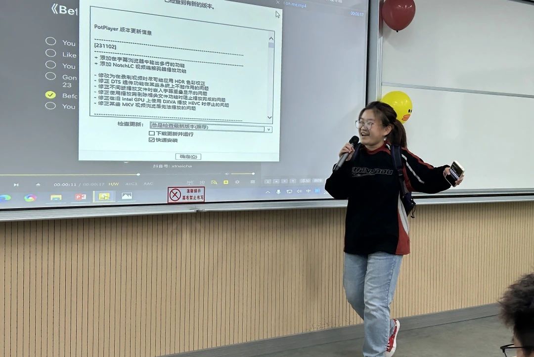 赵嘉璐同学进行的暖场表演,充分活跃了场内气氛,缓解了参赛宿舍的紧张情绪,同学们热情高涨,笑声一片。