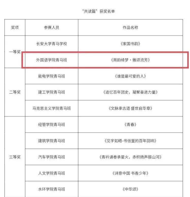 3月29日,我院青马班参加2025年“世界读书日”长安大学青马学校诵读会,作品《周韵绮梦·雅颂流芳》荣获一等奖。