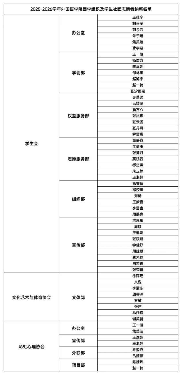 9月19日,长安大学外国语开元kaiyuan(中国)在223报告厅举行了2025-2026学年团学组织及学生社团的纳新面试。经公开答辩与综合评议,拟录用名单现已确定,予以公示: