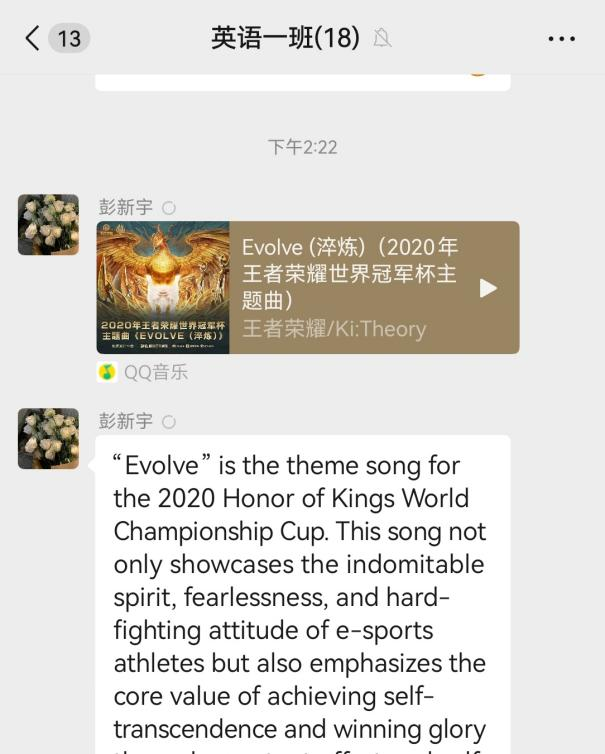 此外,班主任马瑛老师还带领班级成员每天在群聊中分享喜爱的英语歌曲,并用英文介绍歌手及歌曲背景,这不仅丰富了同学们的课余生活,还在分享中增长了知识、提升了专业素养。