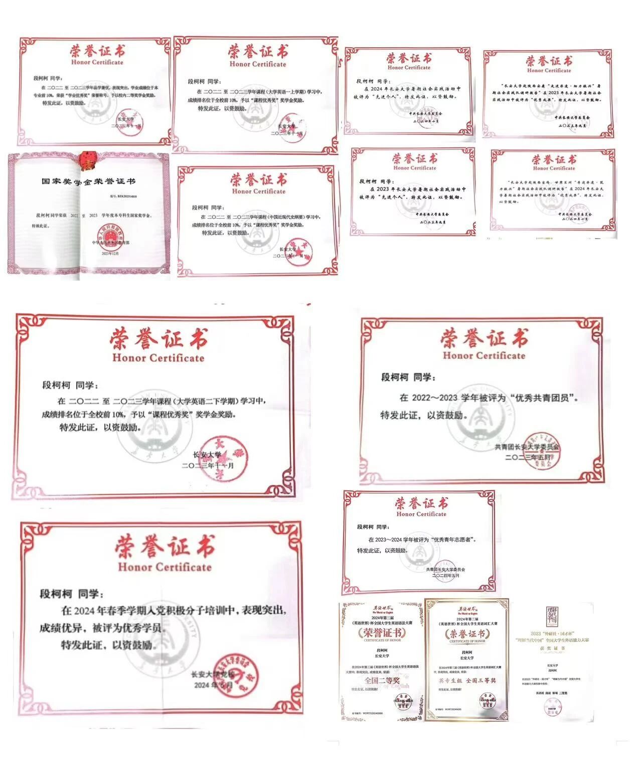 段柯柯,女,共青团员,长安大学外国语开元kaiyuan(中国) 2022 级英语专业本科生,现任长安大学希望阵营主席团成员。2023 - 2024 学年,加权成绩 89.93,专业排名第二。在校期间,她如一颗璀璨的学术之星,荣获奖学金 9项,专四成绩优秀,在学科竞赛的舞台上更是大放异彩,斩获全国大学生英语作文大赛国家三等奖、全国大学生英语翻译大赛省级二等奖、《英语世界》杯全国大学生英语语法大赛全国二等奖等 10 余项殊荣;同时,她在思想与实践领域也收获颇丰,荣获党校“优秀学员”、“优秀共青团员”“优秀青年志愿者”社会实践“先进个人”等荣誉称号。