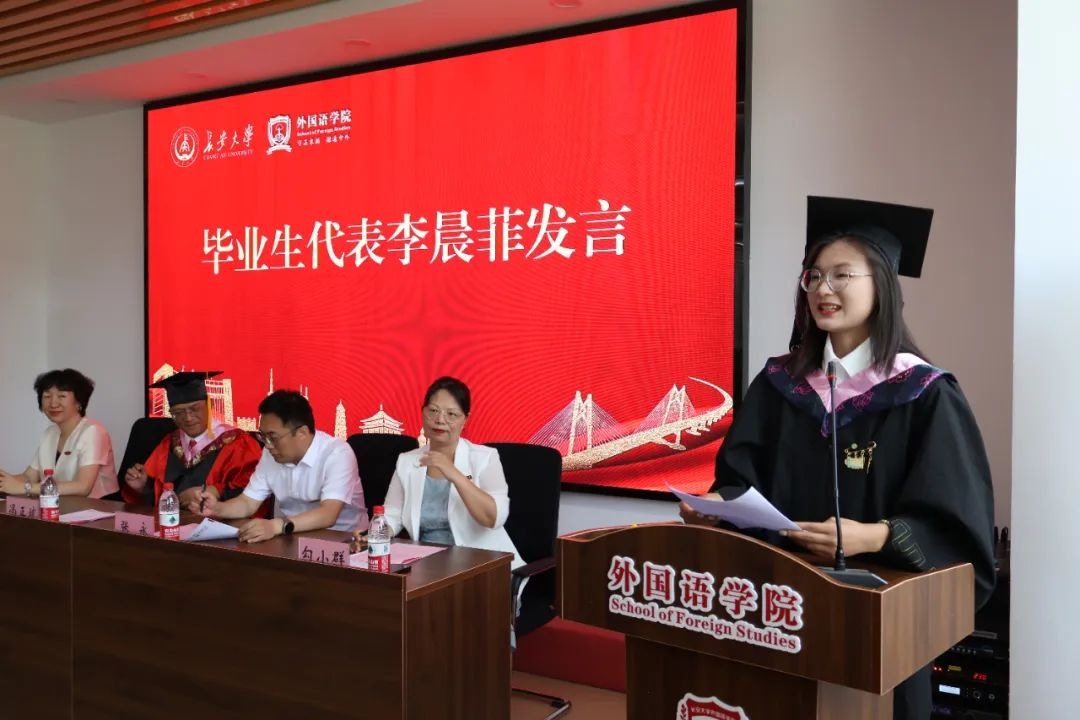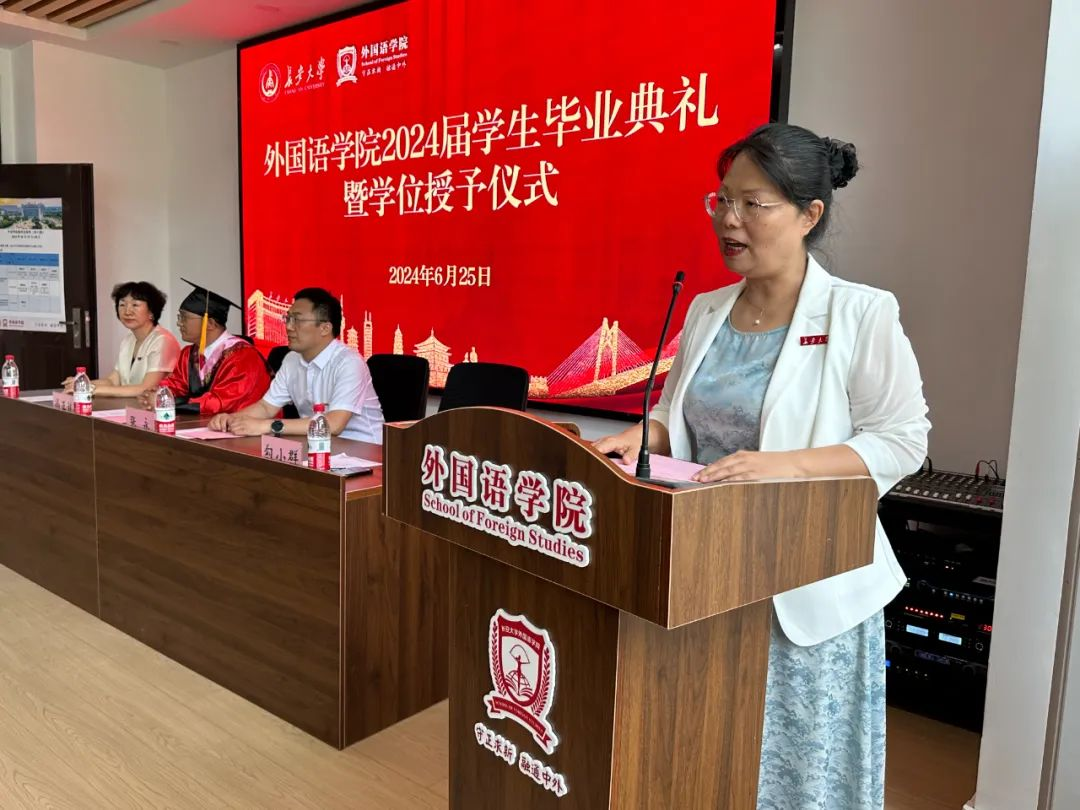 秦思博士作为教师代表发言。她对毕业生们表达了真诚的祝福,同时也为同学们大学生活的付出与收获感到欣慰,并结合自身经历,激励同学们求知求学,保持对语言的热爱和文化交流的敬畏。