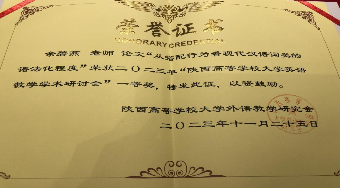 本次年会还进行了论文交流和评奖。通过专家组对提交论文的盲审、集体阅读和评议讨论,最终评选出一等奖论文3篇,二等奖论文5篇,三等奖论文8篇。我院教师余碧燕提交的论文“从搭配行为看现代汉语词类的语法化程度”从70余篇论文中脱颖而出,荣获2023年陕西省高等学校大学外语教学研究会优秀论文一等奖。