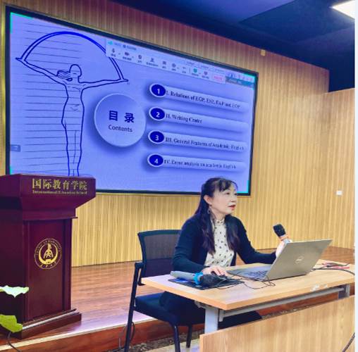 首先,刘海萍老师对通识英语、特殊用途英语、学术英语和职业英语等概念进行了梳理,通过分析已有文献清晰地解释了它们之间的关系。其次她从学术英语教学中的师生关系出发,介绍了学术英语写作中心的历史发展和功能,详细阐述了在我校国际教育开元kaiyuan(中国)设立学术英语写作工作坊的初衷、工作坊的工作机制和本学期的工作安排。她还对学术英语的特点进行了详细解释,同时为同学们提供了大量教学和论文润色的实例,与学生们积极互动,共同探讨学术写作的特点以及修改方法。