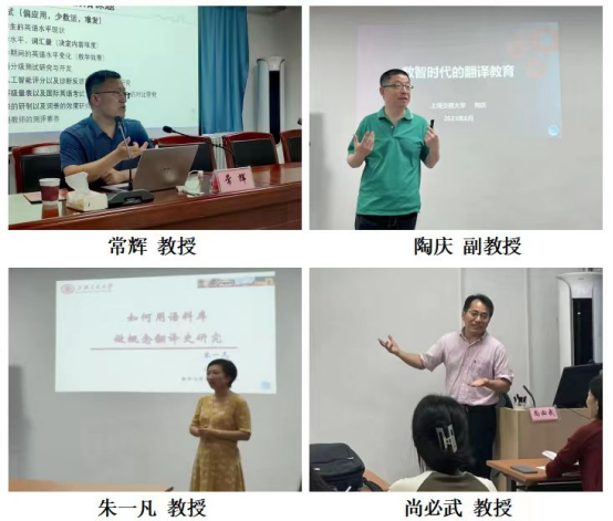 陶庆副教授围绕数智时代的翻译教育,从双语能力,语言外能力,工具能力和战略能力展开分享;管新潮副教授以“翻译与翻译技术”为题,从翻译技术的定义、计算机辅助翻译、语料库研制技术、编程技术及问题与展望几个部分展开讲解,不仅分享了实用的研究技术,同时也鼓励与会教师积极学习并适应新时代下的技术变化。