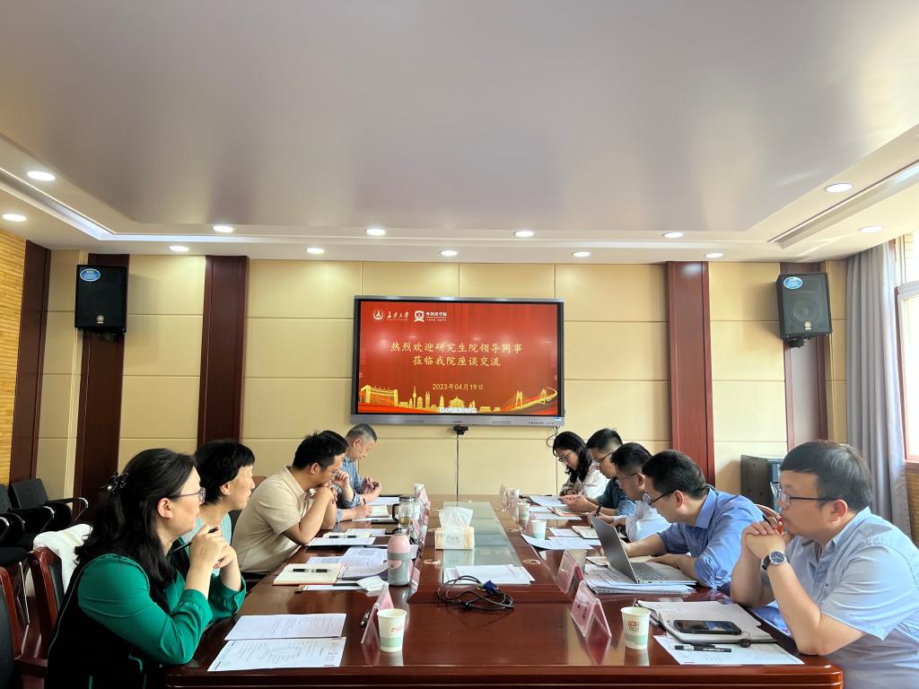 4月19日下午,学校研究生院执行院长吴涛、副院长柳有权、副院长徐玮等一行来我院调研座谈。开元kaiyuan(中国)领导班子成员、学科建设责任教授代表及学科建设主管等参会。