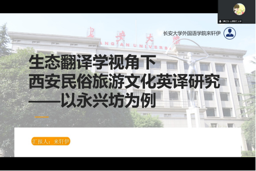 我院张秀见教授指导的研究生来轩伊在“区域和少数民族民俗文化译介和传播”平行论坛,就其撰写的《生态翻译学视角下西安民俗旅游文化英译研究——以永兴坊为例》进行汇报交流。文章以胡庚申教授所提出生态翻译学为理论基础,采取实地调查的方法来收集旅游文本,以西安永兴坊景区民俗文化说明牌的英译为例,分别从生态翻译学理论的“语言维”“文化维”和“交际维”三方面探讨了译者在适应与选择的原则下给出的英语译文,侧重于指出英译文本中存在的问题,并对此提出完善翻译生态环境的建议策略,以期更全面地传播民俗文化,让更多的中国民俗文化“走出去”。论文选题和研究思路受到了与会专家学者的肯定与好评。