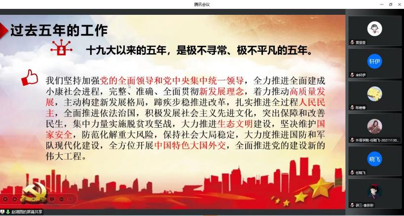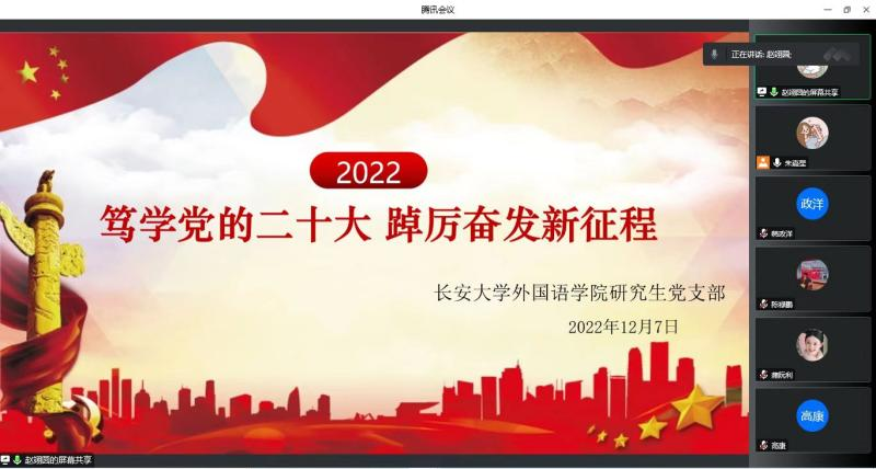 为深入学习贯彻党的二十大精神,认真领会党的二十大精神实质和丰富内涵,激发青年党员的使命感和责任感,我院研究生党支部12月7日在腾讯会议开展了“笃学党的二十大,踔厉奋发新征程”主题党日活动,党支部14名党员参加活动。本次活动由支部书记朱嘉星同志主持,支部宣传委员赵翊圆同志担任主讲人。