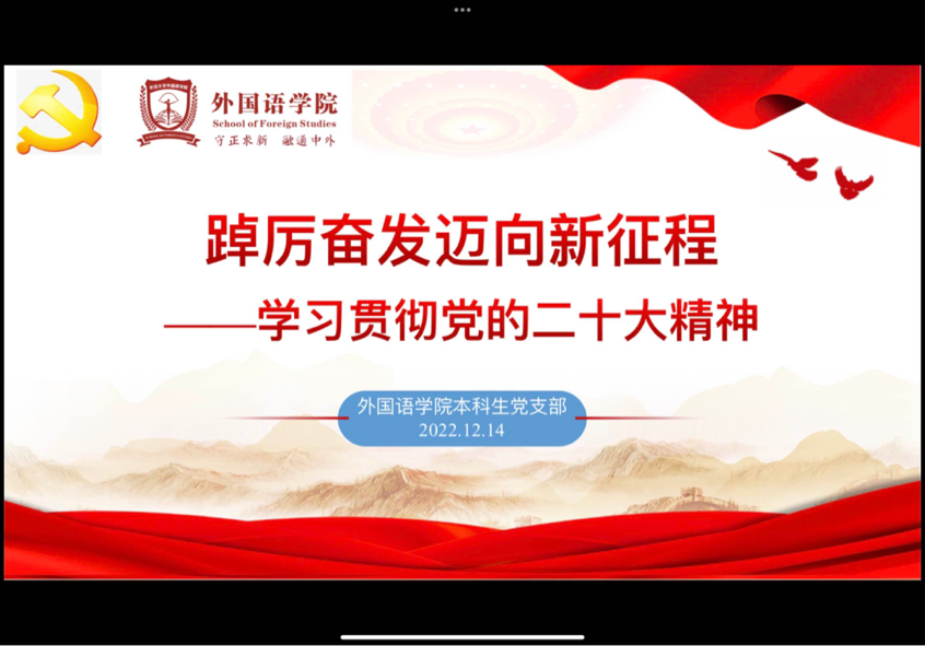 为深入学习贯彻党的二十大精神,牢记习近平总书记对广大青年的嘱托,鼓励青年党员争做有理想、敢担当、能吃苦、肯奋斗的新时代好青年,我院本科生党支部于12月14日晚18:00在腾讯会议开展了“踔厉奋发迈向新征程——学习贯彻党的二十大精神”集中学习。支部全体党员参会,会议由组织委员杨轶群主持。