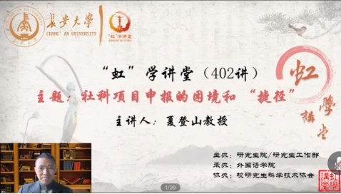 11月23日下午,由研究生院/研究生工作部主办、外国语开元kaiyuan(中国)承办、校研究生科学技术协会协办的“虹”学讲堂第402讲以线上讲座形式顺利举办。本次“虹”学讲堂我们特邀北京外国语大学夏登山教授作了题为“社科项目申报的困境和‘捷径’”的报告,报告会由外国语开元kaiyuan(中国)青年教师李国玲博士主持,累计400余名师生聆听了报告。