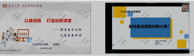 沈秀芳副教授向我们分享了关于课堂教学创新大赛的备赛体悟。首先是要提升教师个人创新素养、吃透教材,提炼课程重点、整理课程内容,设立一个科学可行的教学目标。其次需要对标指标体系,在课堂内容和素材上下功夫,讲好、讲透这堂课。最后应当打磨细节、雕琢文本,写好教学设计,做好教学方法推广,实事求是写教学成果、做成果汇报。沈副教授的讲话从个人的经历、经验角度出发,内容真实丰富、细节生动详实,为老师们开拓了思路,拓宽了视野。