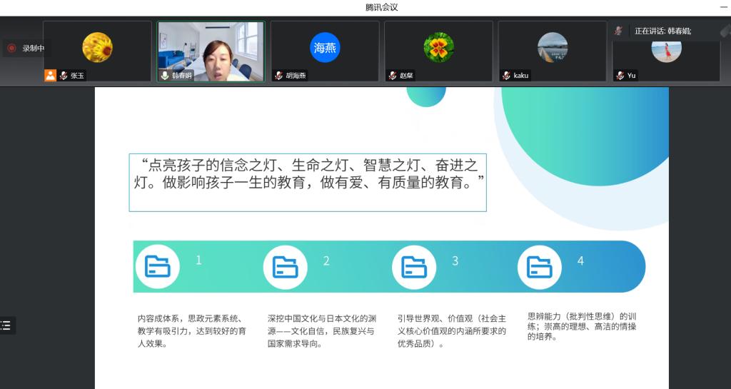 日语系主任韩春娟老师从《高等学校课程思政建设指导纲要》的解读、日本文学概论课教学目标的三重聚焦、融入课程思政的教学模式探索、课程思政的创新与特色等方面分享了《日本文学概论》课程思政的教学案例。分享结束后,胡海燕、郭亚军、张玉三位老师分别谈了自己的感想,纷纷表示韩老师的教学案例为今后的教学提供了值得借鉴的做法和经验,课程思政不仅要着眼于具体的知识解读,更要立足于宏观角度,努力形成完整的育人体系,做影响学生一生的教育,做有爱、有质量的教育。