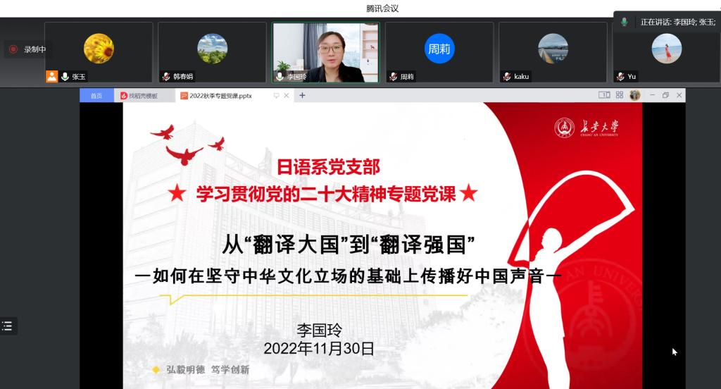 最后,日语系党支部书记李国玲传达了近日组织支部成员参加由人民中国杂志社主办的“党的二十大重要文献日文翻译讲座”的情况,并结合讲座所学内容,讲授了题为“从‘翻译大国’到‘翻译强国’——如何在坚守中华文化立场的基础上传播好中国声音”的专题党课。与会的各位老师结合自己的教学科研情况,就如何推动党的二十大精神进课堂、进教材、进头脑做了交流分享。