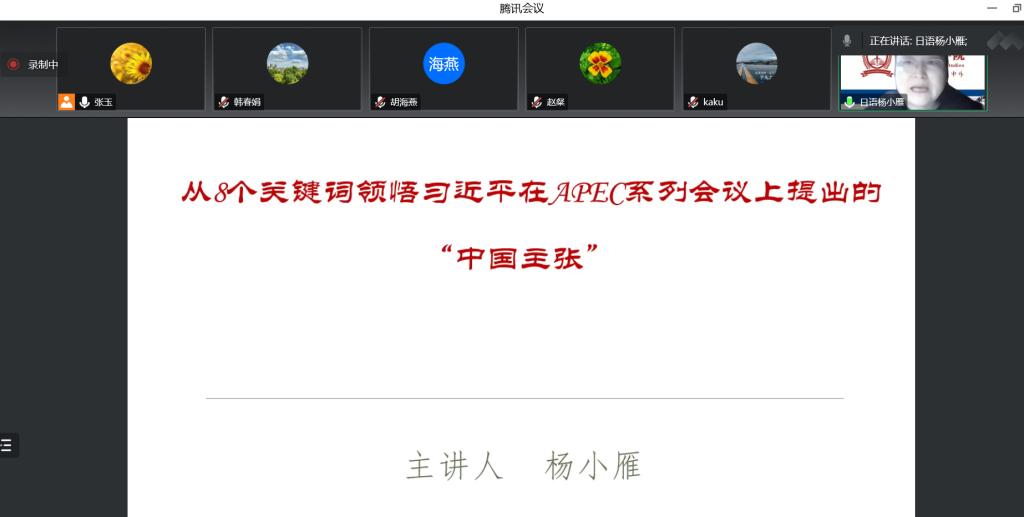 随后,杨小雁老师带领大家一起学习了人民网-中国共产党新闻网站上2022年11月21日刊发的题为《从8个关键词领悟习近平在APEC系列会议上提出的“中国主张”》的报道。学习结束后,全体党员围绕如何将“中国主张”融入课堂思政展开了热烈的讨论,纷纷表示要在学生的课堂展示、课后作业等环节将“中国主张”巧妙地融入进去,引导学生在外语专业课堂的学习中掌握对外传播中国声音的技能。