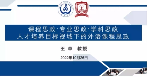 王卓教授还结合自身工作经历向参会师生分享了新时代课程思政的具体案例,并提出各类课程建设和教学竞赛中所存在的问题,通过对成功案例的分析以及对现存问题的反思,为当前人才培养目标视域下的外语课程思政实践提供了启发性指导。王教授指出:“课程思政”既是一种全新的教育观,也是对知识观和课程观的重构和再认识。她勉励参会教师要讲有灵魂的课,要了解课程背后的故事,更要做该课程领域的专家。