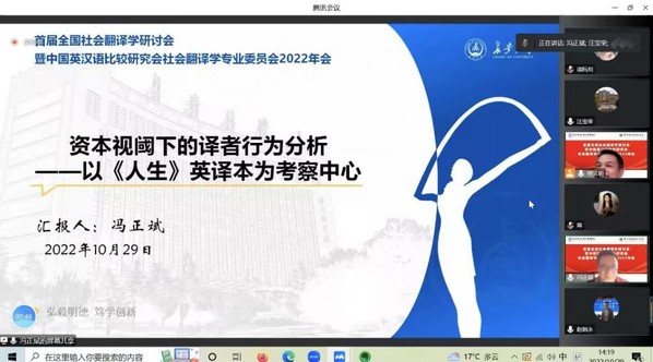 为进一步推动我国社会翻译学研究,促进翻译学科建设和人才培养,助力我国对外翻译能力与国际传播能力的协调发展,为国内专家学者搭建学术交流和对话的平台,“首届全国社会翻译学研讨会暨中国英汉语比较研究会社会翻译学专业委员会2022年年会”于2022年10月28日至30日召开。我院冯正斌教授和秦思博士受邀出席,二人分别以“资本视阈下的译者行为分析—以《人生》英译本为考察中心”和“美国的中国古典禅诗译者研究—以萨姆·汉米尔与赤松为例”为题做了大会交流。