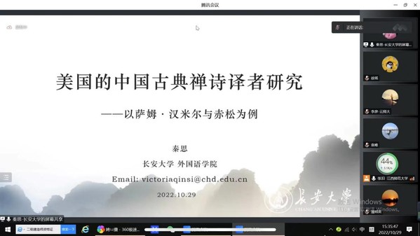 秦思以“美国的中国古典禅诗译者研究—以萨姆·汉米尔与赤松为例”为题进行阐述,她从社会翻译学视角出发,以萨姆·汉米尔和赤松这两名美国著名阐诗译者为例,来解读禅诗译者的翻译行为。她认为禅诗译者群体的产生归因于译者初始惯习对宗教、文化场域等外在社会客观环境的内化,具有相似的文化特性,译者各自的人生轨迹也导致了其译介行为存在一定的独特性和差异性,正是相似性与差异性并存,才使得该群体通过译介行为构建了英译禅诗传统,丰富了其内容与发展。