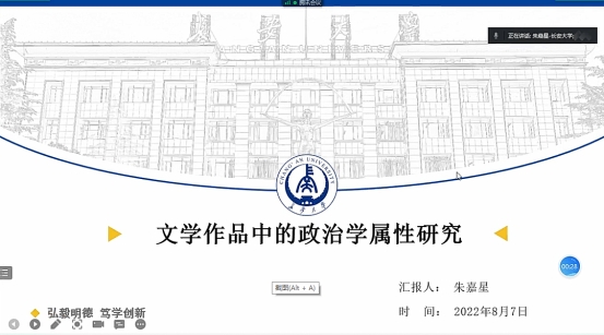 我院刘宇老师指导的研究生朱嘉星在“外国文学跨学科研究理论构建与文学革新”主题专场,就其撰写的《文学作品中的政治学属性研究》进行汇报交流。文章从文学、政治学等核心概念入手,深入阐释了文学作品和政治学的三种关系,进而总结出文学作品中所体现的政治学属性,并通过具体的文本举例说明此观点,论文内容受到了与会专家学者的肯定与好评。