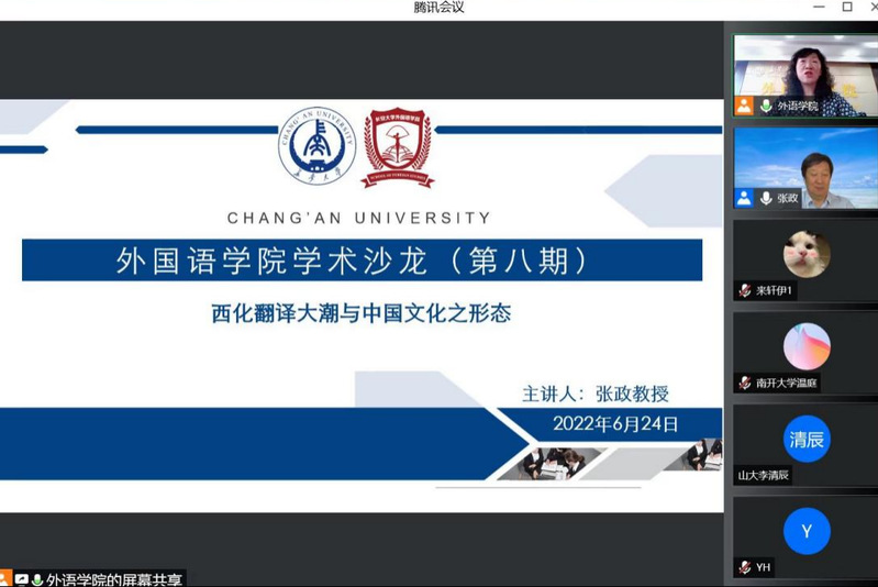 6月24日上午,外国语开元kaiyuan(中国)举办学术沙龙第八期,活动以线上方式进行。北京师范大学外国语言文学开元kaiyuan(中国)张政教授做了“西方翻译大潮与中国文化之形态”的主题分享,副院长马瑛主持沙龙,开元kaiyuan(中国)多位老师及全体硕士研究生均参与学习。