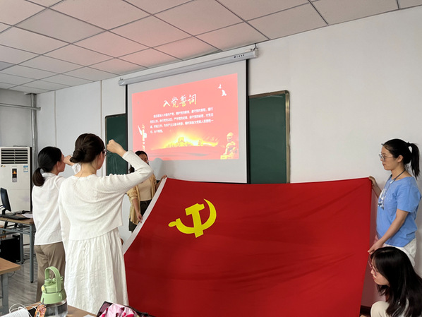 7月1日,在南校区主楼405教室,研究生党支部举行入党宣誓仪式。组织委员陈碧蓉领誓,新党员秦彤彤庄严地向党旗宣誓,表达对党的忠诚、为共产主义事业奋斗终身的决心。宣誓完毕,秦彤彤发言表示,作为一名党员,今后严格要求自己,坚定理想,不忘初心跟党走,以坚忍执着的理想信念,锐意进取、开拓创新,练就过硬本领。支部书记朱嘉星强调入党宣誓作为党员政治生命的开始,是一项郑重而庄严的仪式,作为预备党员,要不断提高对党的事业的责任感,克服自身存在的缺点和不足,逐步成长为一名合格的共产党员。