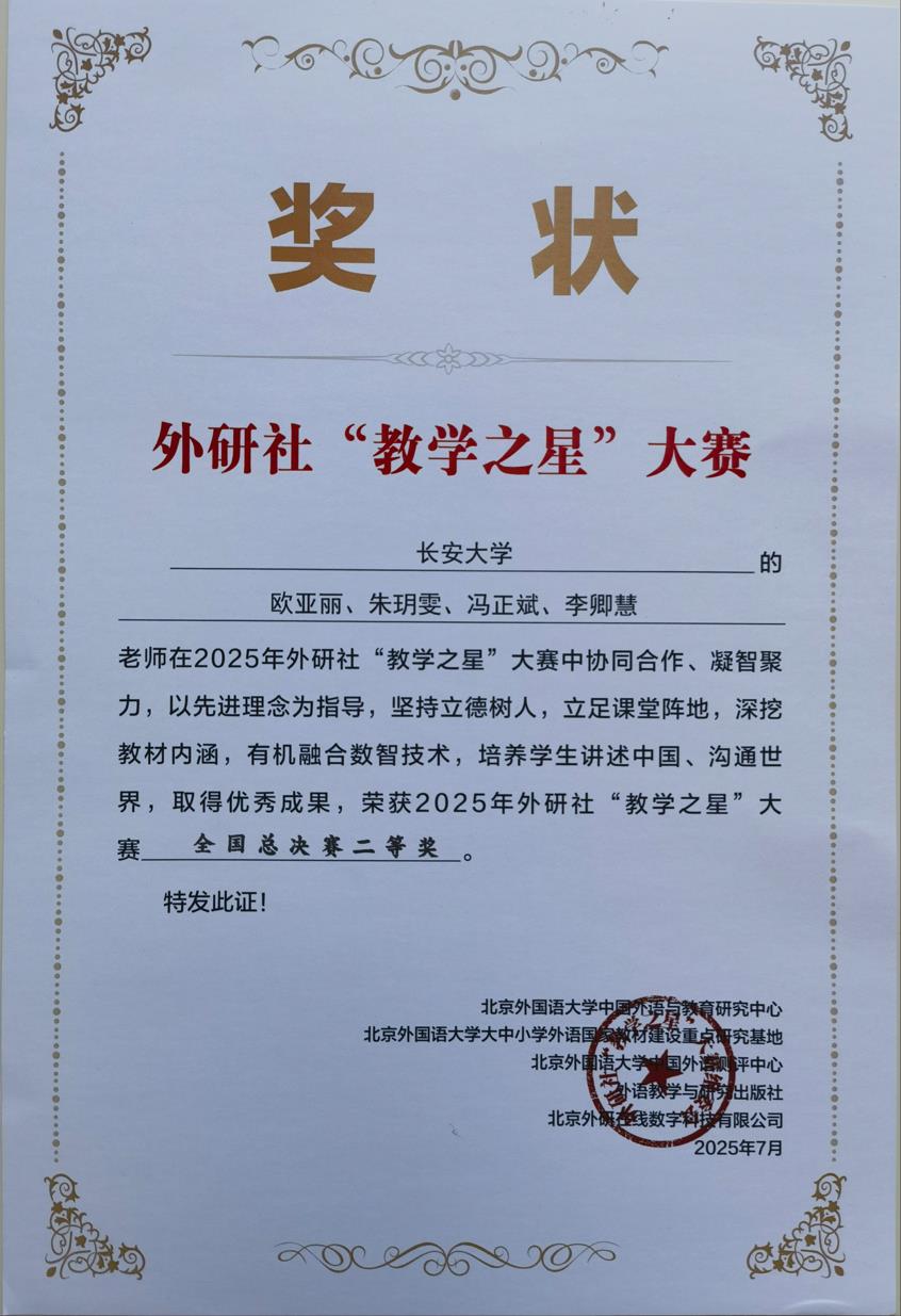 近日,2025年外研社“教学之星”大赛(FLTRP Star Teacher Contest)传来捷报,长安大学外国语开元kaiyuan(中国)欧亚丽教师团队表现突出,荣获全国总决赛二等奖。