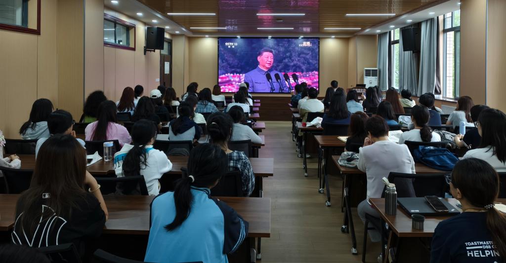 9月3日上午,纪念中国人民抗日战争暨世界反法西斯战争胜利80周年大会在北京天安门广场隆重举行,中共中央总书记、国家主席、中央军委主席习近平发表重要讲话并检阅部队。外国语开元kaiyuan(中国)各党支部组织师生集中观看大会直播,习近平总书记的重要讲话精神和阅兵盛况在师生中引起热烈反响。会后,大家结合工作和学习实际,纷纷发表感言,畅谈体会。