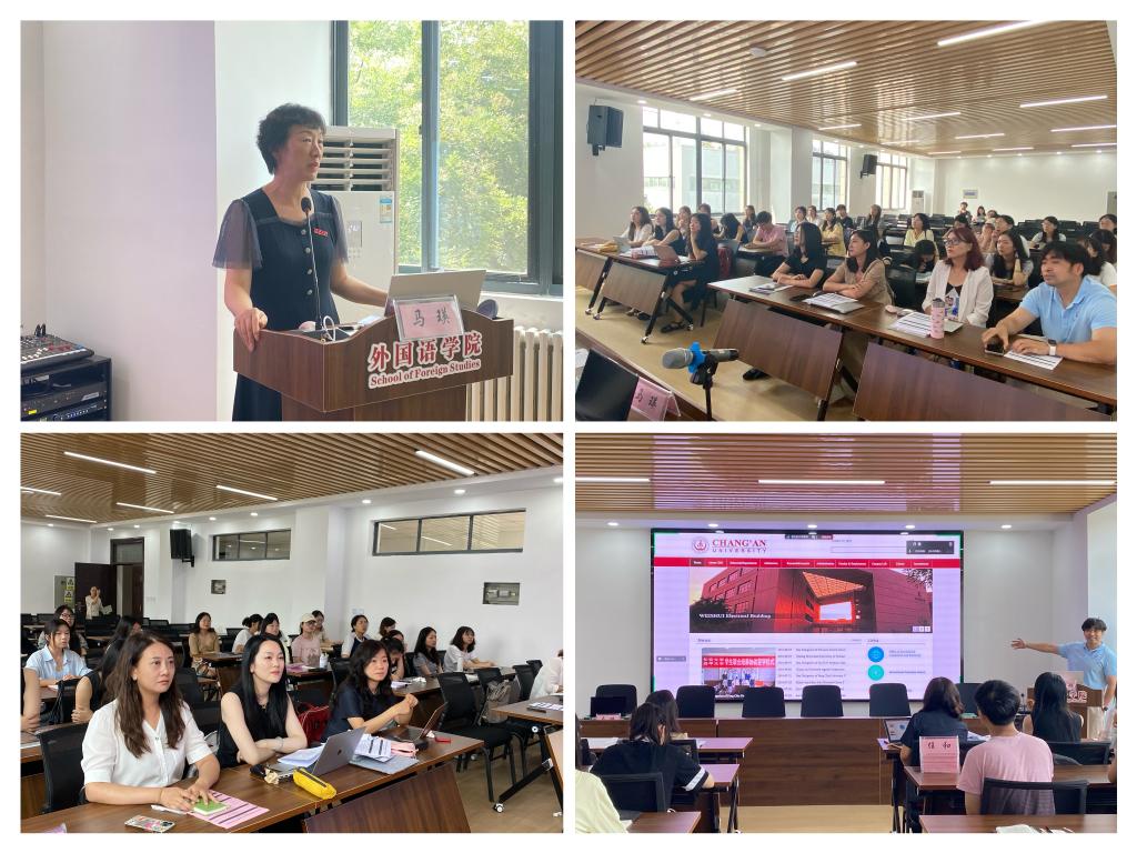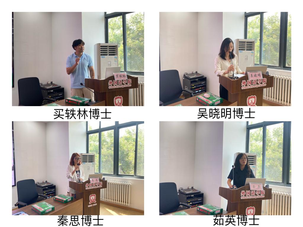 随后进入到学术讲座环节,我院四位青年博士先后聚集各自的研究方向展开分享。买轶林博士做了题为“The public face of ideology :How university present themselves through written texts on their own websites”的讲座,以长安大学和谢菲尔德大学官网为例,对不同表达类型的语法特征及表达习惯做了生动的诠释;吴晓明博士以“教、学、评一体化:大学英语教师课堂评估认知及实践研究”为题,从概念、影响力、实施情况、反馈分析等多方面介绍课堂评估策略(AfL)策略在大学英语课堂推广使用中的现状及面临的问题,并对产生原因做了深入分析;秦思博士以“多元化译者身份与翻译的跨场域建构”为题,以赤松的译介作品中国古典诗歌类为例,从语言学派与文化学派对其进行不同的诠释,从译者研究的不同身份出发,将不同学派的翻译内涵精神相联系,从学术角度展示了翻译的灵活与多样性;茹英博士以“文化符号与跨文化传播”为题,从文化符号的定义和分类切入,探讨了文化符号在跨文化传播中的关键作用及其重要性,阐明文化符号,包括图像、声音等具有特定文化意义的符号对于个体和社会认同的构建和传播具有不可或缺的影响。