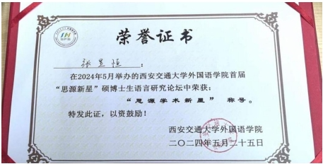 2024年5月25日,西安交通大学首届“思源新星”硕博士生语言研究论坛顺利召开,我校外国语开元kaiyuan(中国)2023级研究生张昱恒、崔萌经过选拔参会并进行现场论文宣读。张昱恒同导师共同合作的论文“中国明清公案知识的世界性建构——以高罗佩译创实践为例”荣获思源学术新星奖。