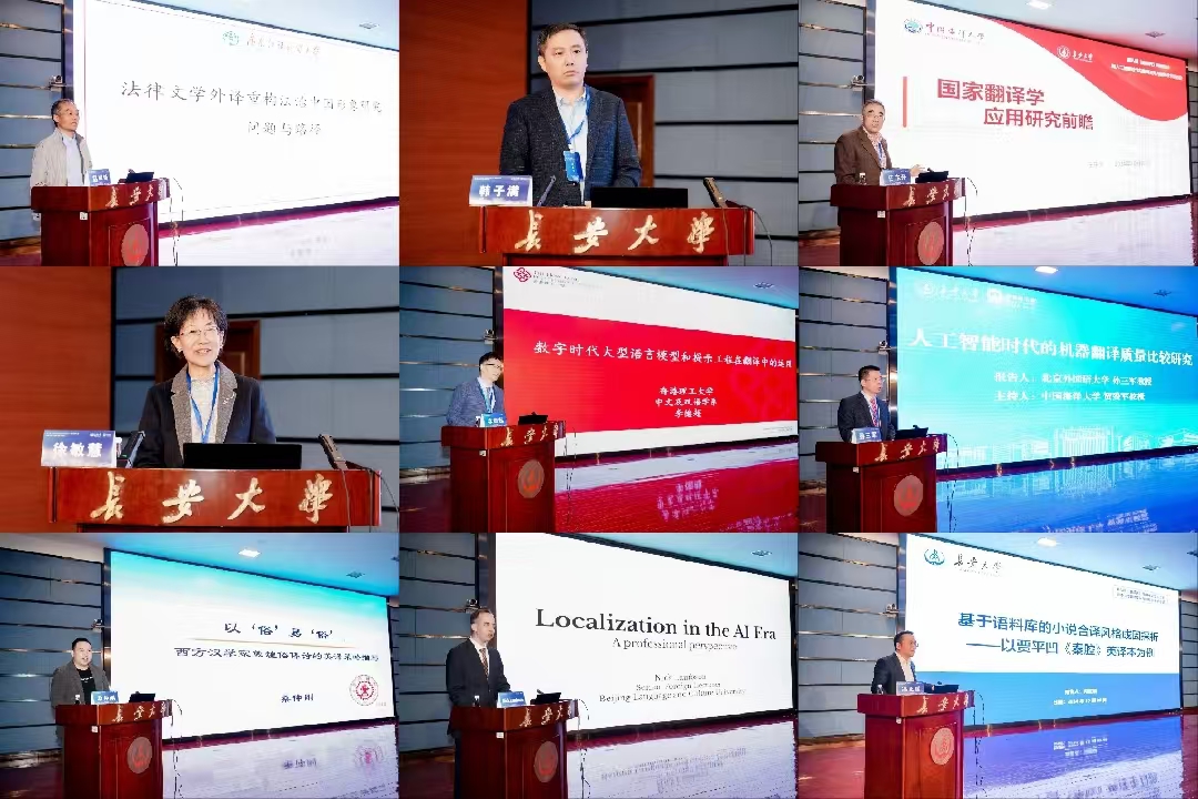 第四届全国翻译专业学位研究生教育指导委员会副主任委员、广东外语外贸大学赵军峰教授作题为《法律文学外译重构法治中国形象研究:问题与路径》的主旨报告,长安大学“长安学者”领军人才夏登山教授进行点评;上海外国语大学韩子满教授作题为《中国特色术语英译的官方视角与学术视角——以“总体国家安全观”为例》的主旨报告,河南大学刘泽权教授进行点评;中国海洋大学任东升教授作题为《国家翻译学应用研究前瞻》的主旨报告,上海外国语大学耿强教授进行点评;澳门大学徐敏慧教授作题为《The transformed translators’roles in the era of digitalized translation——A sociological perspective》的主旨报告,广东外语外贸大学蓝红军教授进行点评;香港理工大学李德超教授作题为《数字时代大型语言模型和提示工程在翻译中的运用》的主旨报告,西安外国语大学李向东教授进行点评;北京外国语大学孙三军教授作题为《人工智能时代的机器翻译质量比较研究》的主旨报告,中国海洋大学贺爱军教授进行点评;西安交通大学桑仲刚教授作题为《以“俗”易“俗”:西方汉学家的敦煌俗体诗英译策略》的主旨报告,湖南大学李伟荣教授进行点评;北京语言大学Nick Lambson教授作题为《Localization in the AI Era: A Professional Perspective》的主旨报告,华中师范大学魏家海教授进行点评;长安大学冯正斌教授作题为《基于语料库的小说合译风格成因探析——以贾平凹〈秦腔〉英译本为例》的主旨报告,中南大学仲文明教授进行点评。