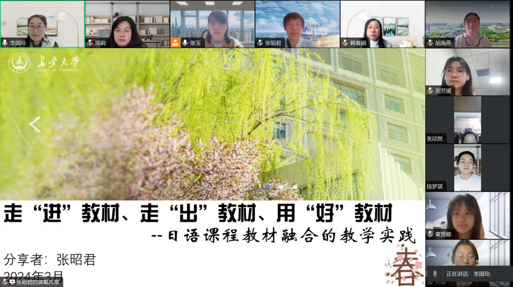 张昭君老师从“日语教学何为”这一提问切入,基于深度学习、教材与学材、大单元教学等教学理论,详细地分享了在大学日语教学中如何融合使用《新经典日本语》《新一代大学日语》《日语读写教程(“理解当代中国”日语系列教材)》等多种教材,培养学生的思辨能力、引导学生讲好中国故事的教学实践,建议从教学目的出发,与时俱进地发现新的教学素材、提高教学内容的深度与趣味性。参会师生纷纷表示深受启发,并就具体的教学设计、教学技巧等问题与张老师进行了充分的交流。