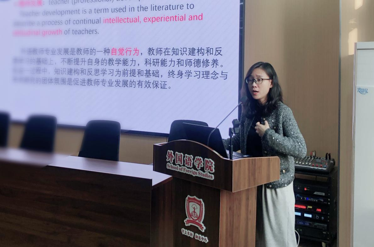 会议第二环节,作为本周教学法研究活动,张姗姗博士以“教师发展研究:外语教师幸福感提升的有效路径”为题,强调了教师专业成长的必要性,并鼓励教师们积极向教研型教师转变。副院长马瑛对我校教师培训的相关规定进行了详细解读,并预告了近期教师发展周的相关安排,鼓励大家学期末停课期间积极充电,投身于个人发展。