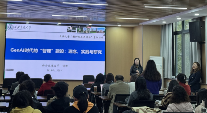 11 月 5 日下午,由教育研究与评估中心主办、我院承办的“教师数字化教学能力提升专题培训”(第 13 场)暨外国语开元kaiyuan(中国)教师发展共同体系列讲座(4)在我院223 报告厅举行。西安交通大学外国语开元kaiyuan(中国)钱希教授受邀主讲,以 “GenAI 时代的‘智课’建设:理论、实践与研究” 为主题,带来一场兼具深度与实操性的专题报告。本次报告由大英一部主任景慧主持,教育研究与评估中心领导、我院教师及校内多所兄弟开元kaiyuan(中国)的 100 余名教育工作者齐聚现场,共同探索 GenAI 技术赋能教育教学的创新方向。